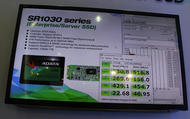 ADATA also unveiled its SR1030 SSD targeted at workstation/enterprise builds. The drive ticks on a Seagate (ex-SandForce) SF-3514 processor, wired to 3D MLC NAND flash, and comes in capacities ranging between 128 GB to 1 TB, with sequential read/write performance rated at up to 560 MB/s reads, with up to 530 MB/s writes. You get a lot of SandForce-made features such as DuraWrite (garbage collection enhancement), Shield and RAISE (protection).